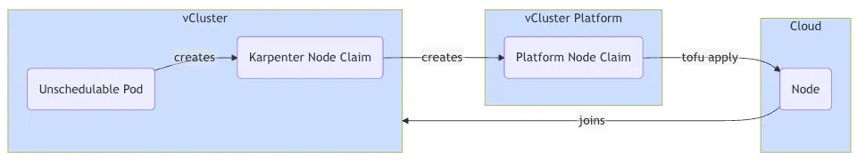 Auto Nodes provides the Karpenter-style intelligence that makes this economically viable. When you submit a GPU workload, Karpenter detects the unschedulable pod and creates a NodeClaim that specifies the required resources. The vCluster platform then intercepts this claim and triggers the GCP Node Provider, which provisions a Compute Engine VM with the appropriate GPU type. The new VM boots up via Cloud-Init and joins your vCluster as a dedicated worker node. Your pod is scheduled within seconds of the node becoming ready.