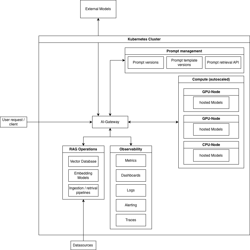A key enabler for this architecture is Kubernetes (k8s), which provides the orchestration layer for deploying, scaling, and managing LLM services and supporting components. Kubernetes allows us to standardize deployments across environments, efficiently utilize GPU resources, implement autoscaling for inference workloads, and ensure high availability of critical services like the AI-Gateway, embedding pipelines, and vector databases. It also simplifies the operation of hybrid setups where self-hosted and external models coexist.