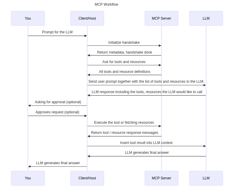 In the following chart, you can find a standard MCP flow where the LLM uses a specific tool of an MCP-Server to fulfill the task. In this case, we assume that the host and the client are part of the same application. But it is also possible that the client and the host are fully decoupled.
